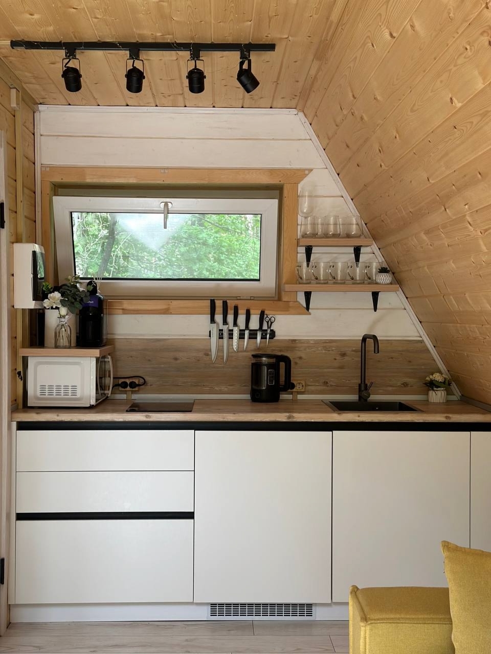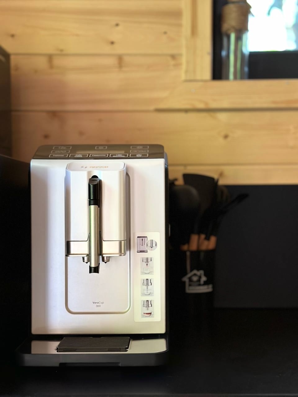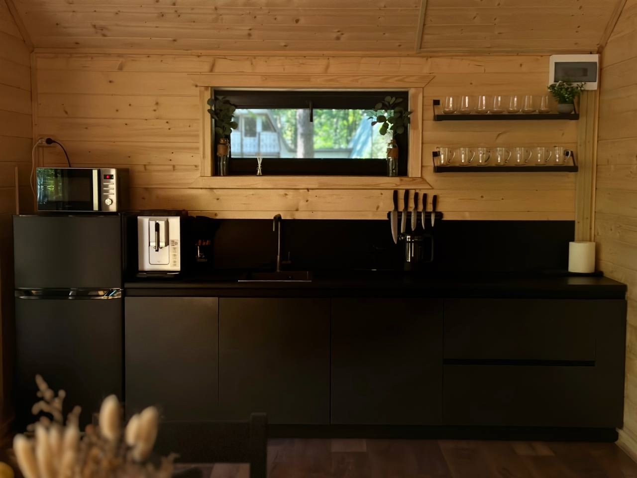 ‣ кухня со всем необходимым для приготовления пищи (холодильник с морозильной камерой, чайник, индукционная варочная панель на 2 конфорки, все виды тарелок черного и белого цветов, столовые приборы, стеклянный салатник, три кастрюли разных размеров, сковорода, чашки для эспрессо, чашки для чая/кофе, стаканы, бокалы под красное вино, бокалы под белое вино, разделочные доски, шампуры, зерновая кофемашина с зернами внутри, чай, соль/сахар, подсолнечное масло/соевый соус/некоторые приправы);